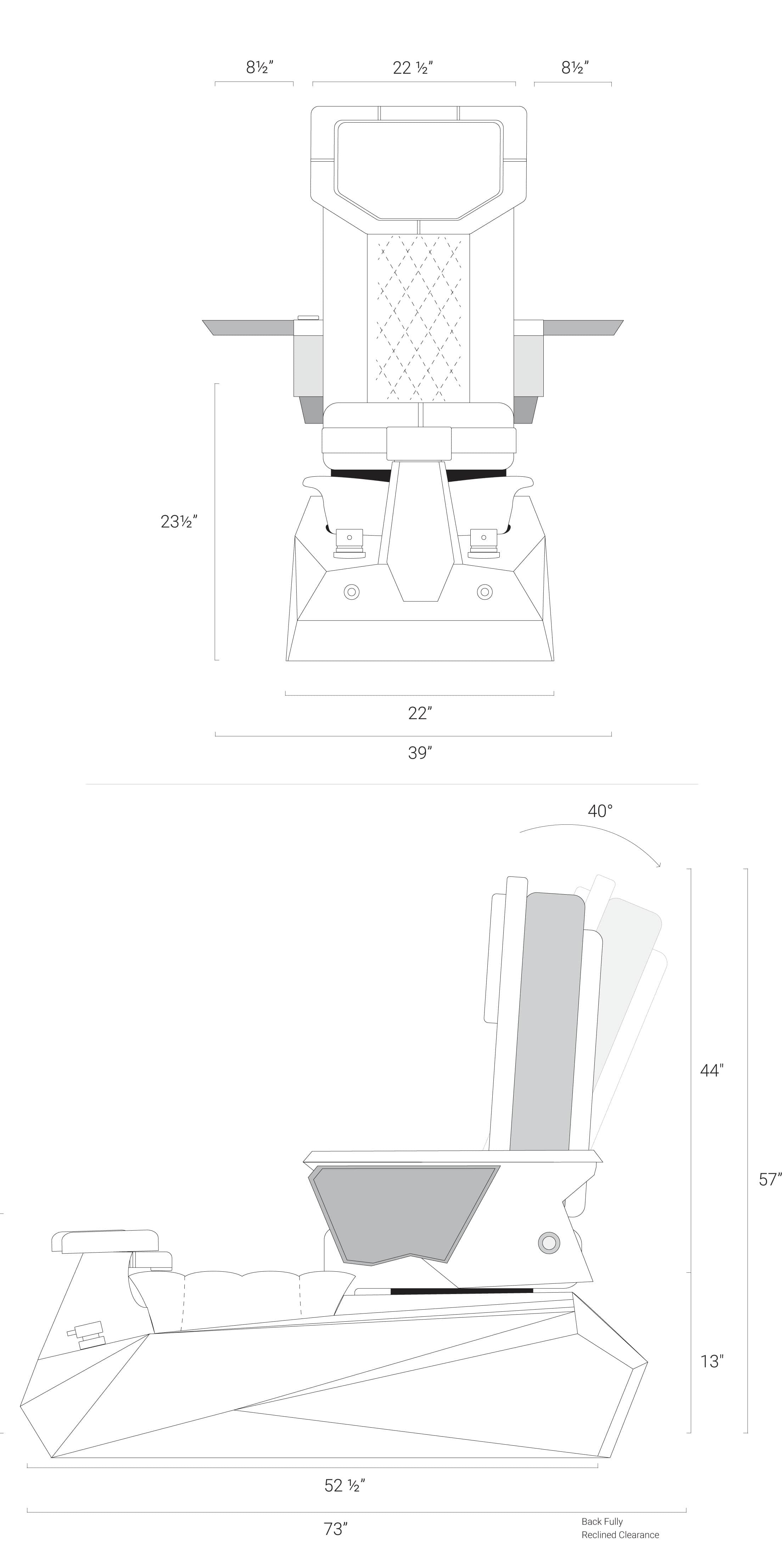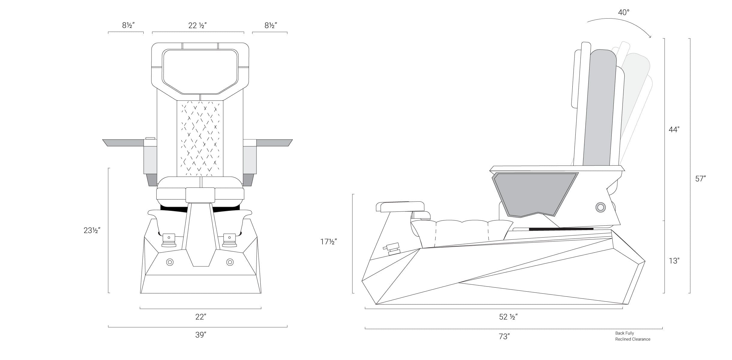The patent-pending pistol-style armrests feature multiple protective layers, making them acetone- and glue-resistant. Integrated trays offer extra workspace for simultaneous manicures and pedicures. -