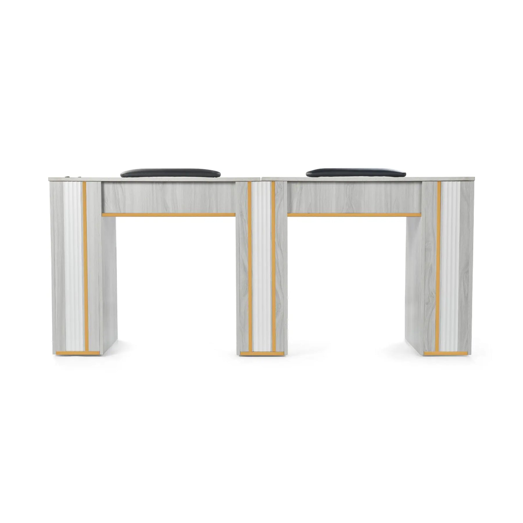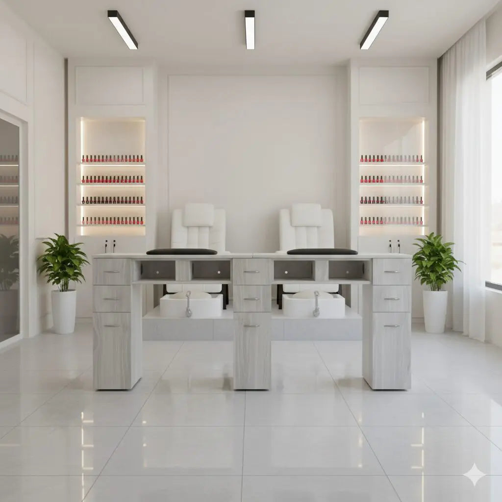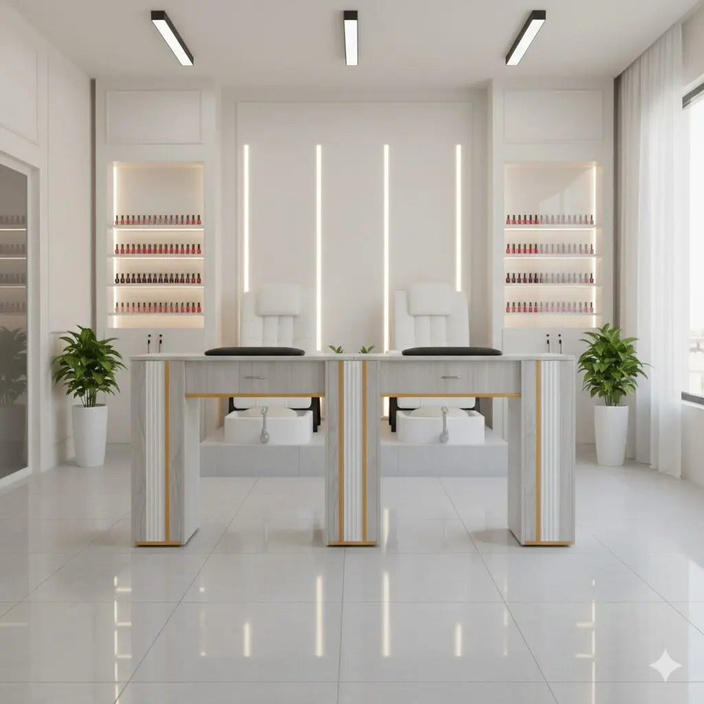 Increase productivity and elevate your salon’s interior with the GrayGold Nail Double Table, a premium double manicure workstation designed for busy, high-traffic nail salons. This professional nail table allows two technicians to work comfortably side by side, maximizing floor space while maintaining a clean, organized, and luxury appearance.
