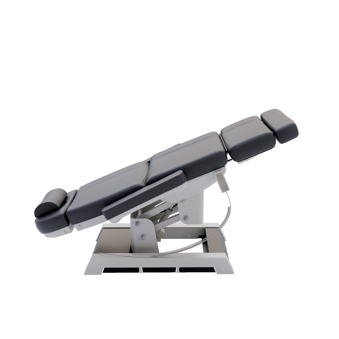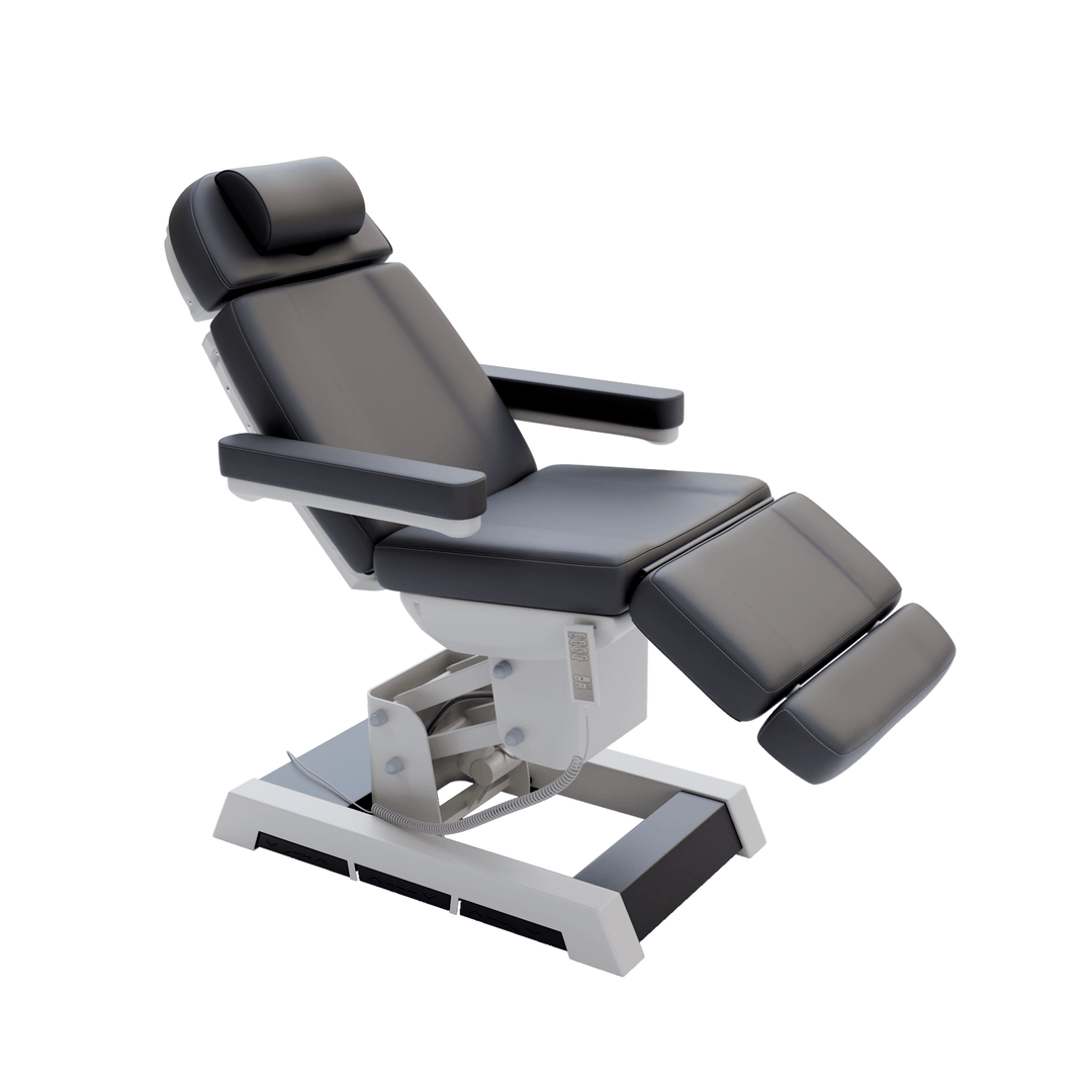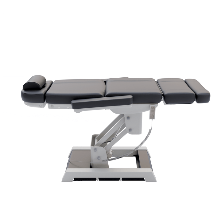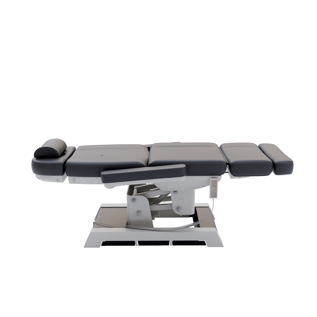 This robust treatment chair/bed is equipped with four motors that enable adjustments for height, backrest, footrest, and tilt. It includes a standard hand remote for easy control of all features, including reset and lock functions.