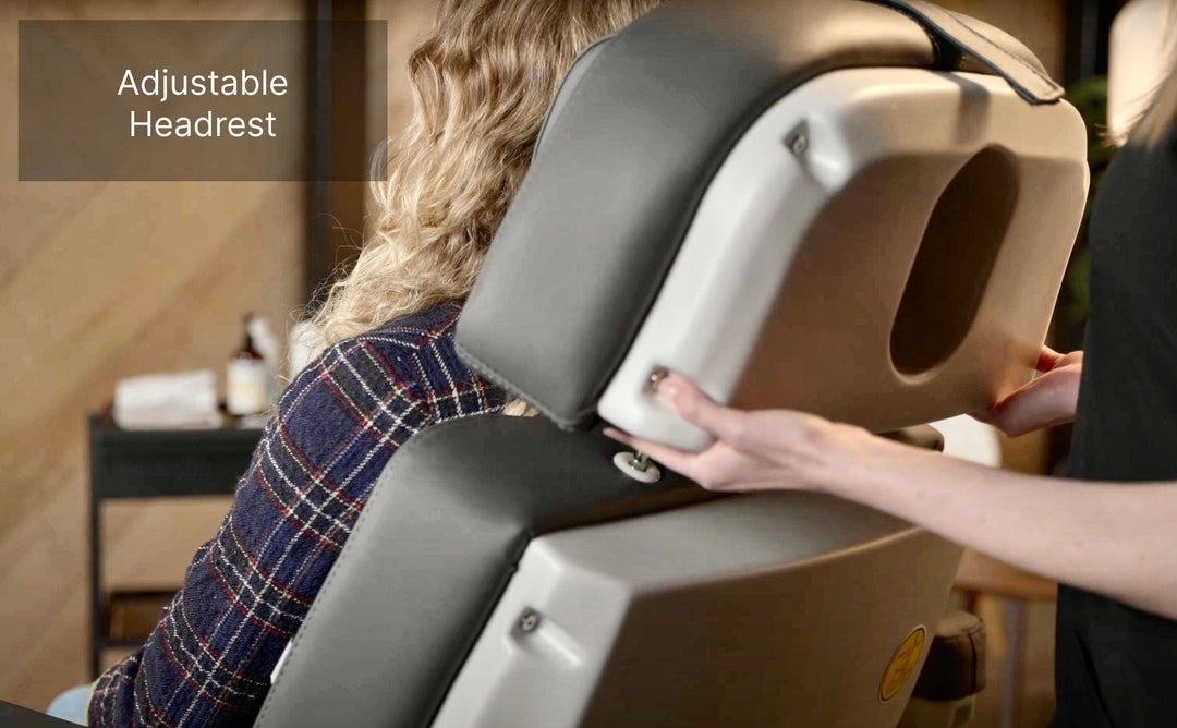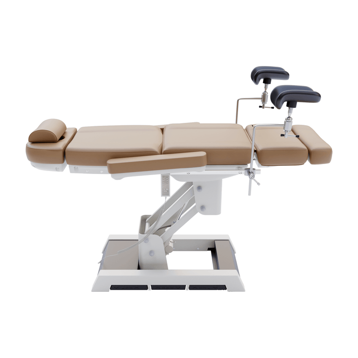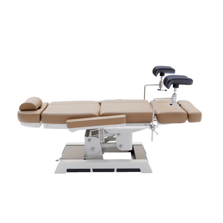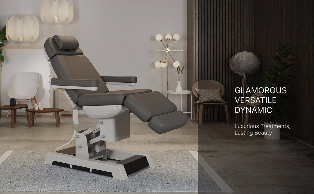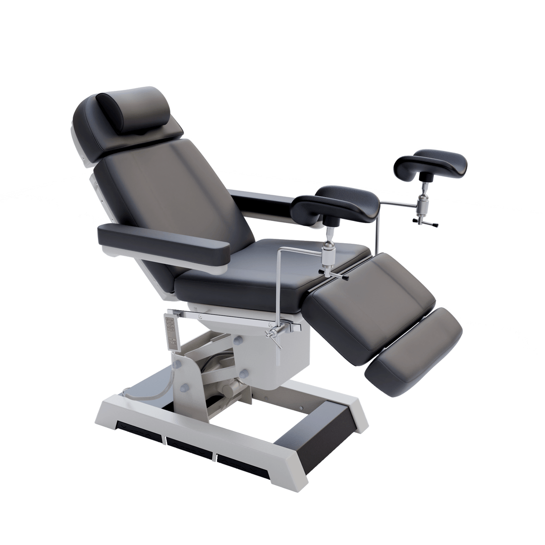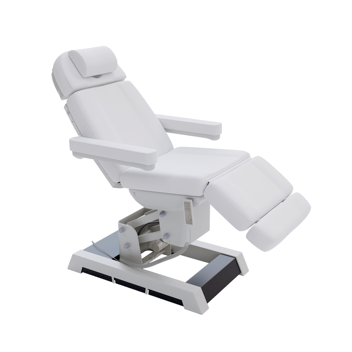 This robust treatment chair/bed is equipped with four motors that enable adjustments for height, backrest, footrest, and tilt. It includes a standard hand remote for easy control of all features, including reset and lock functions.