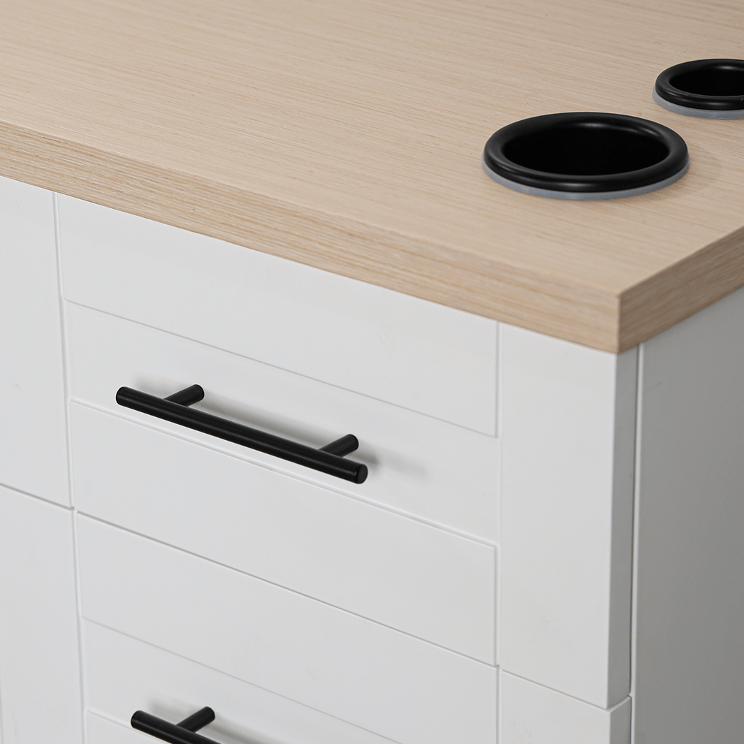 The Midtown Styling Station is the perfect blend of style and functionality, designed for modern salons and barbershops. Featuring a warm walnut-stained wood top, this station offers ample storage with a full cabinet and five drawers, all accented by sleek matte black pull handles. Equipped with three built-in appliance holders, it's an elegant solution for organizing tools and enhancing your workspace.