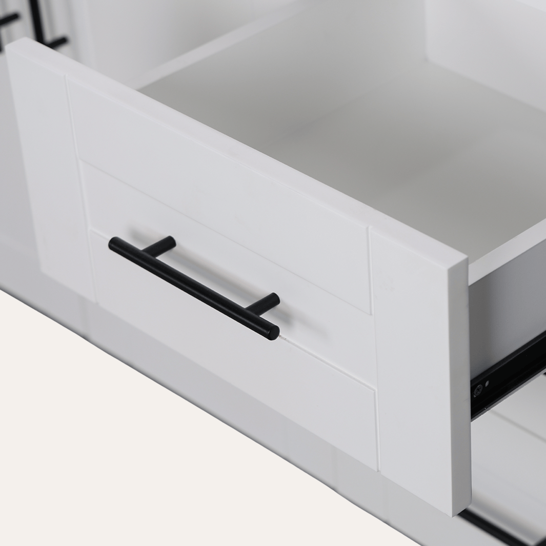 - Four medium pull-out drawers (note: top drawer dimensions are different to accommodate appliance holders)