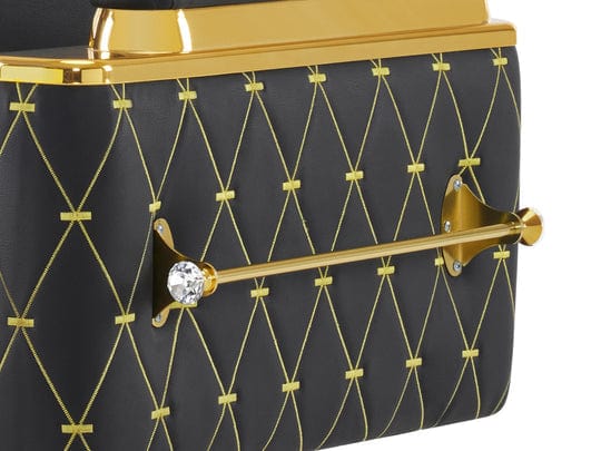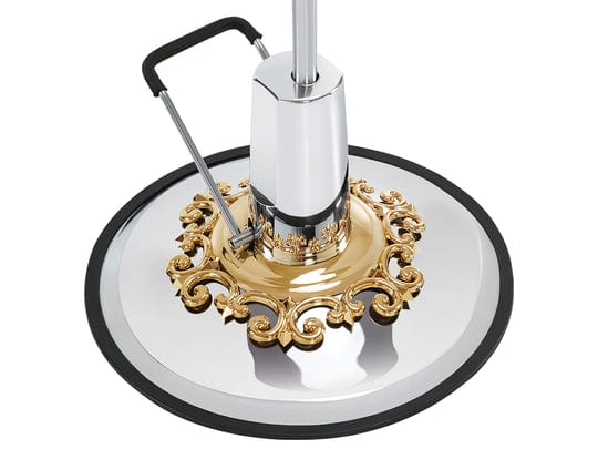 Upgrade your barbershop with the ROYALE Barber Chair, a perfect fusion of elegance, comfort, and durability. Designed with gold accents, a diamond-adorned towel hanger, and a decorative floral base, this luxury barber chairenhances any modern or classic salon setting. Built for both aesthetic appeal and practical functionality, it offers superior lumbar support, a reclining backrest, and a heavy-duty hydraulic pump that supports up to 440 lbs.