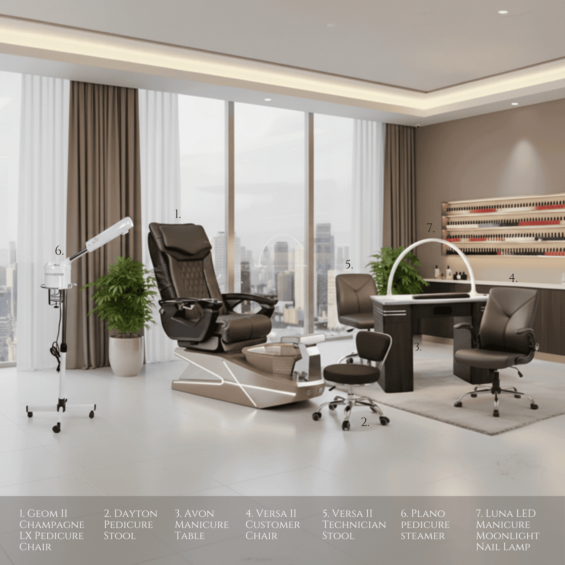 The GEOM II 7-Set Package – Champagne delivers a refined balance of luxury, comfort, and performance—making it the ideal choice for salons seeking a fully equipped, elegant, and high-end professional environment.