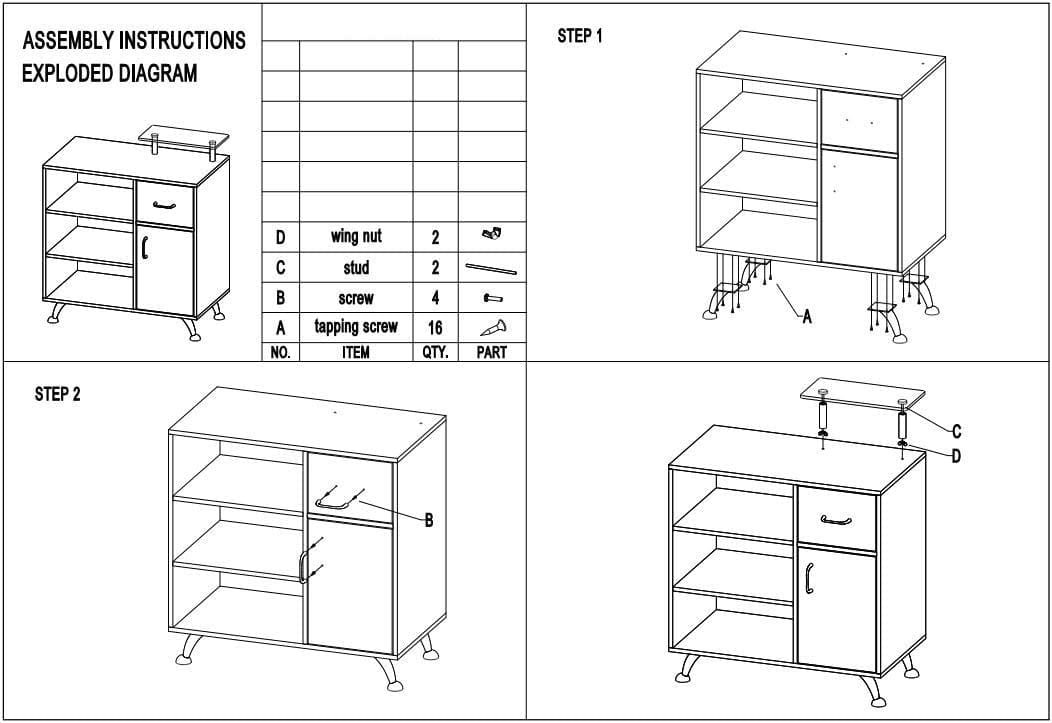 • Spacious cabinets: built with one large drawer, one cabinet with door, and three spacious open compartments.