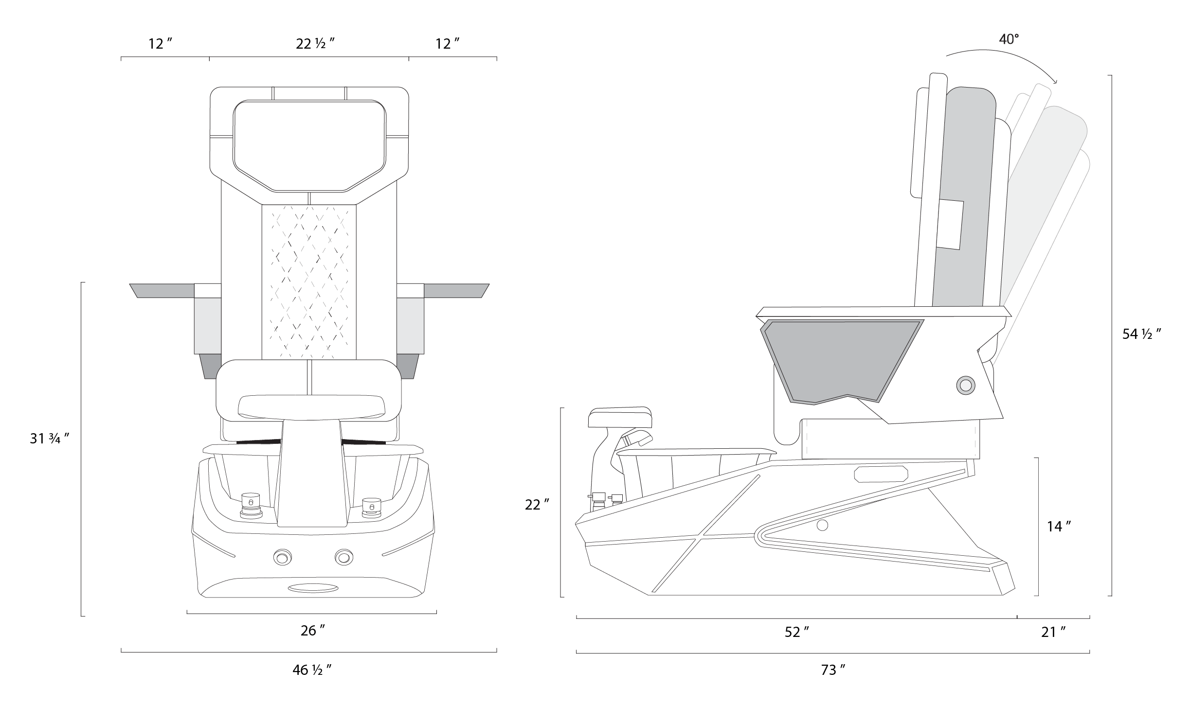 Innovative Armrests: Acetone- and glue-resistant pistol-style arms with built-in trays for simultaneous manicures and pedicures.