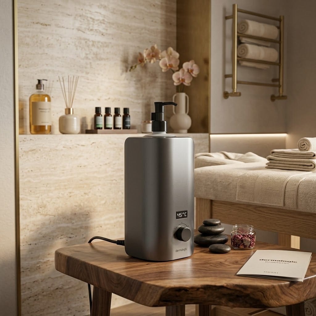 The Dermalogic Massage Oil Warmer II offers a sleek design with practical features. Its matte exterior keeps oils at the perfect temperature, while the digital display and dial allow for precise adjustments. The pump ensures smooth dispensing every time. With the ability to switch between Fahrenheit and Celsius and real-time temperature display, it combines style, performance, and value.