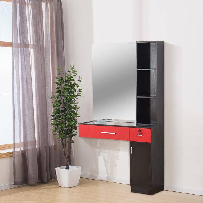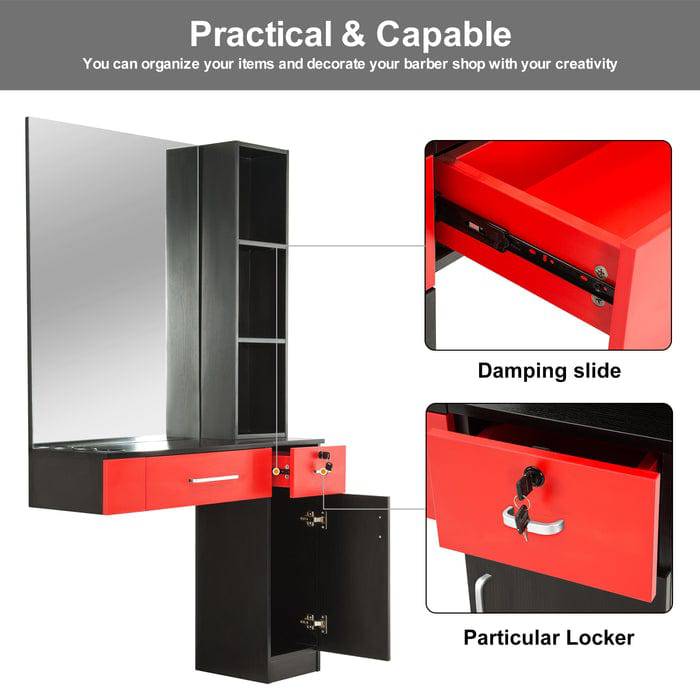 Introducing our European Contemporary Archer Wall-Mounted Styling Station – a versatile workstation offering abundant storage and sleek design. Its streamlined profile enhances the aesthetic of any salon setting. Crafted from durable particle board, the station boasts a uniform black, white, or red & black veneer surface, elevating both appearance and practicality. This veneer decorative board not only enhances surface brightness but also ensures resistance against wear while simplifying cleaning routines. Elevate your salon with this functional and stylish addition.