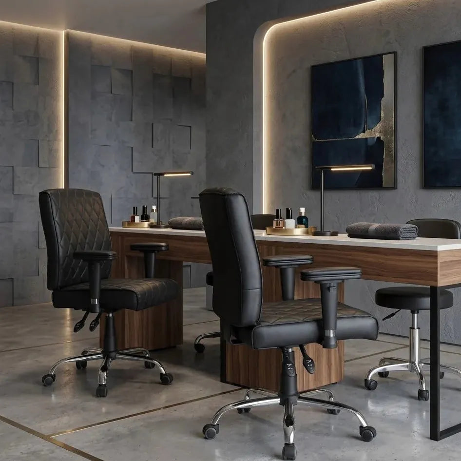 Mayakoba's customer chairs and technician stools are designed for long appointments — supportive, adjustable, and finished in a range of upholstery colors to complement any salon interior.