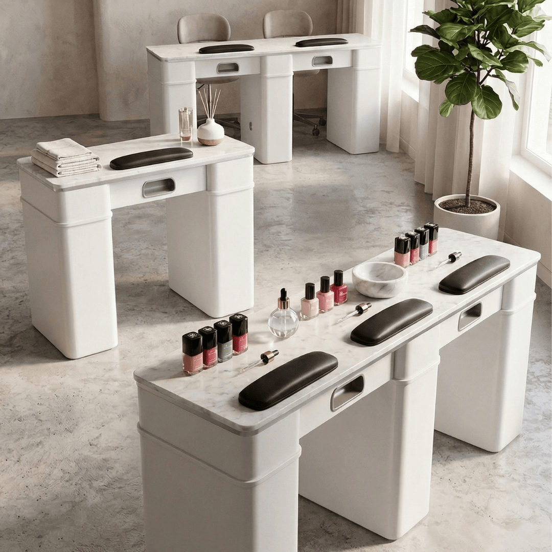 From single stations to multi-section configurations, Mayakoba manicure tables are crafted with acetone-resistant surfaces, clean-line design, and optional ventilation — everything your technicians need to work with confidence.